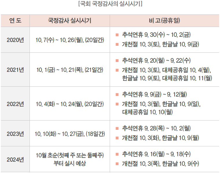 국회는 소관 상임위원회별로 매년 30일 이내의 기간을 정하여 국정 전반에 관하여 국정감사를 실시하고 있습니다. 「국정감사 및 조사에 관한 법률」에 따르면 국정감사는 정기국회 이전에 실시하는 것이 원칙입니다. 그러나 본회의 의결이 있으면 정기국회 중에도 실시할 수 있으며, 이를 위하여 본회의에서 ‘20xx년도 국정감사 정기국회 기간 중 실시의 건’을 의결합니다. 실제로 국정감사는 매년 정기국회 기간 중인 10월 초순(첫째 주 또는 둘째 주)부터 20일 내외의 기간 동안 실시되고 있으며, 올해 역시 10월 초순부터 약 20일간 실시될 것으로 예상하고 있습니다.